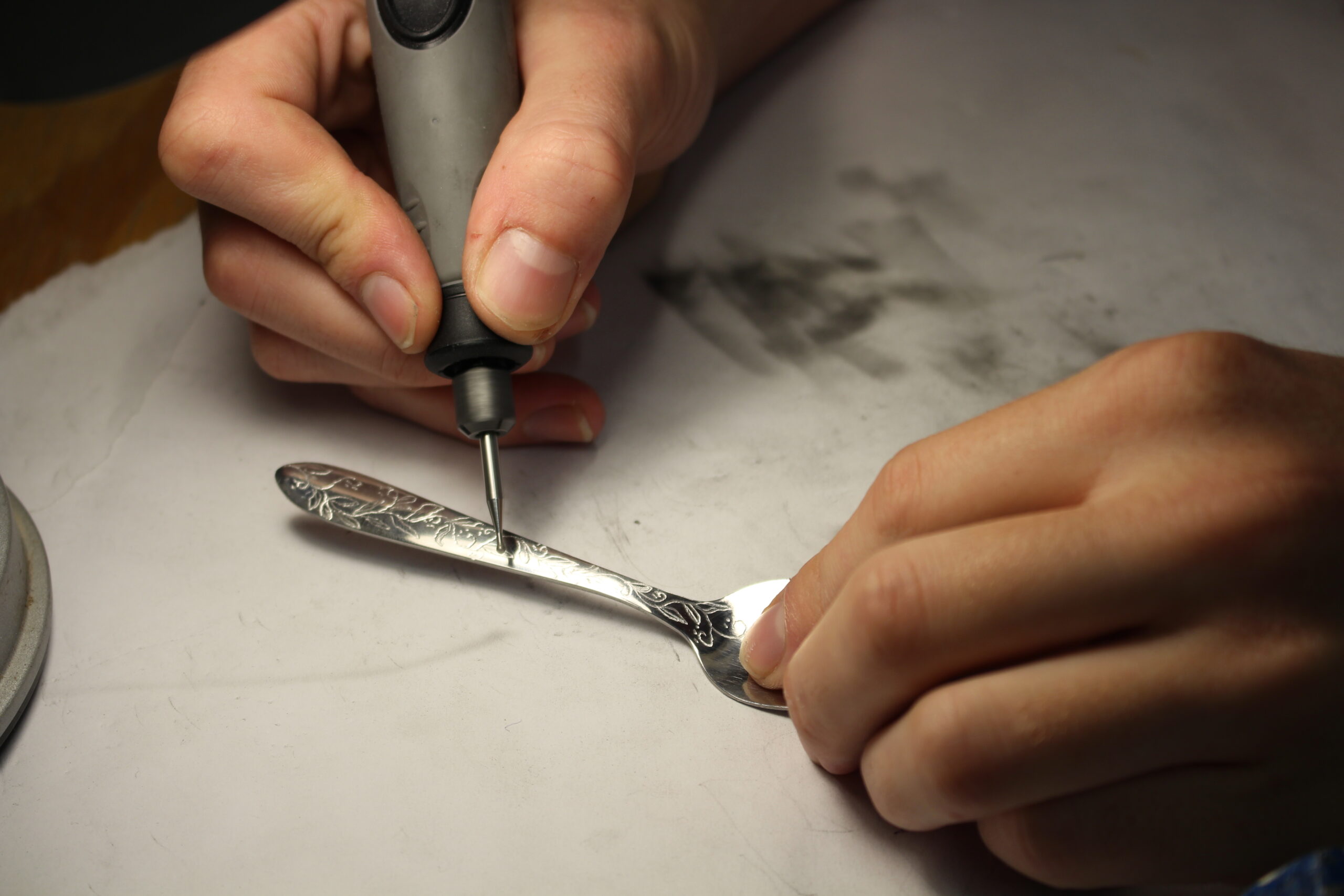 Ik gebruik bestek als mijn canvas. Met een dremel grafeer ik elk stuk met de hand: op gevoel, soms speels, soms subtiel, altijd met karakter.